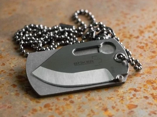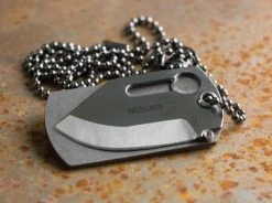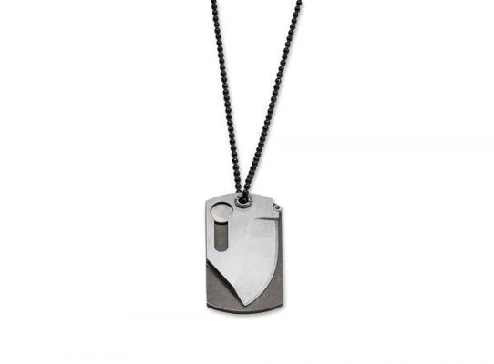 24 gram light-weight Dog Tag Knife. Like its namesake, it is carried around the neck on a ball chain and boasts a thickness of less than 4 mm when retracted (measured without blade pivot point). The chisel grind (single-sided blade grind) provides maximum carrying and operating safety by contacting the titanium liner as closely as possible with the flat backside of the edge. A clever magnetic mechanism also secures the neck knife in the retracted and deployed state; in each case, the action is strictly accomplished with magnetic force, but with a true locking mechanism instead. As a result, accidental deployment is eliminated even when engaged in active/dynamic activities. The back side of the titanium liner is ideally suited for laser engraving of the name, nickname, medical data, etc. Shipped with ball chain and carabiner.