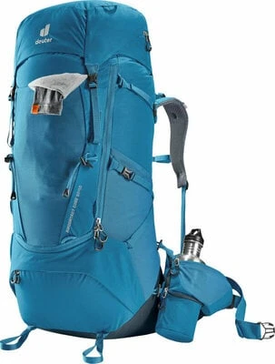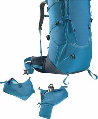 Its superior carry comfort is down to the deuter Aircontact back system with Air Spacer mesh and a large ventilation channel, plus ergonomic ActiveFit shoulder straps and an adjustable sternum strap. The Y-shaped frame, mobile hip fins and ergonomic lumbar pad combine to distribute the load effectively. A full-length, J-shaped zipper on the front makes contents easy to locate lower down in the main compartment. While large, detachable hip fin pockets (3 L) provide extra storage and keep items within reach. A zip-out 1.5-liter bottle holster also lets you hydrate on the move.