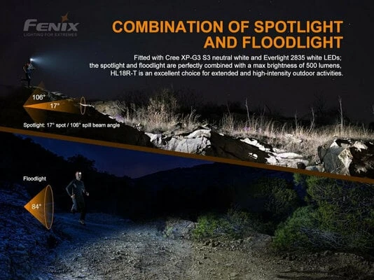 - Fitted with Cree XP-G3 S3 neutral white and Everlight 2835 white LEDs; the spotlight and floodlight are perfectly combined with a max brightness of 500 lumens, HL18R-T is an excellent choice for extended and high-intensity outdoor activities.
