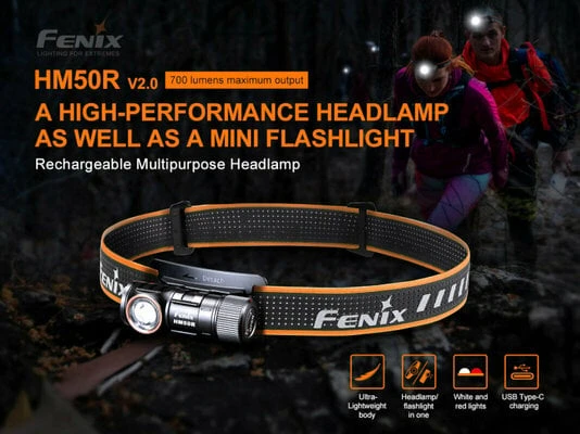 The Fenix HM50R V2.0 is a rechargeable multipurpose headlamp. One 16340 rechargeable Li-ion battery is included to power it. This headlamp is power-packed throwing a 700 lumens beam to a maximum distance of 115 meters. The HM50R V2.0 is outstanding with its solid construction and lightweight size, plus it is detachable to be used as a mini flashlight. This rechargeable headlamp combines white and red lights, comes with a USB Type-C charging cable and features an IP68 rating, all of which make the Fenix HM50R V2.0 perfect for camping, hiking or working in rigged environments.