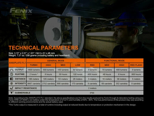 *Work normally for 4 hours at 2 meters underwater. According to the ANSI PLATO FL1 standard, the above specifications are from the results produced by Fenix through its laboratory testing.