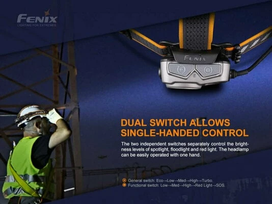 The two independent switches separately control the bright ness levels of spotlight, floodlight and red light. The headlamp can be easily operated with one hand.