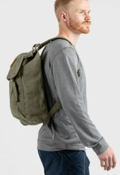 The backpack has a top lid with textile straps and metal buckles. There is also a compartment for a laptop.