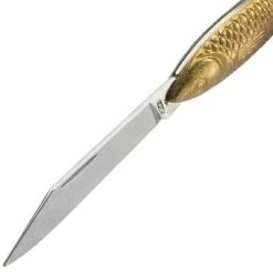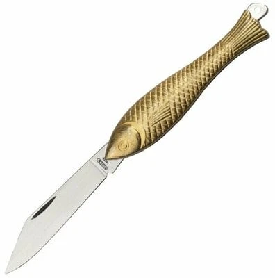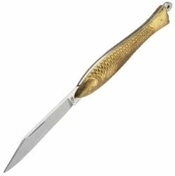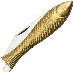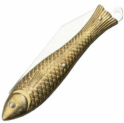 Small vintage pocket knife with stainless steel blade has a fish shaped handle. With its great detail level looks like a animal figurine instead of a knife. The knife handle is made of durable zinc in gold color.