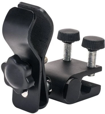Flashlight holder for helmets. Made of durable black plastic. The holder is attached to the adhesive surface. The angle of adjustment can be adjusted as required.