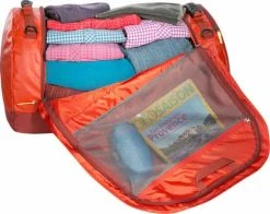 The Barrel M travel bag from Tatonka has a capacity of 65 liters and can accommodate the luggage of a one-week trip. To make the bag easy to carry, it is equipped with backpack shoulder straps that can be stowed in a zippered pocket.