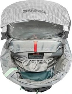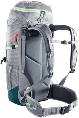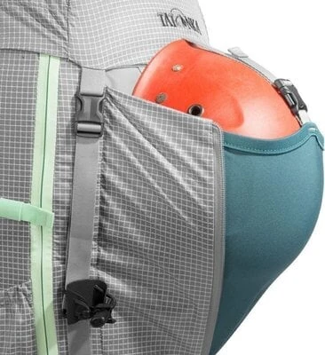 To put on your climbing harness, you can remove the hip belt from the backpack. Quick access to your equipment in the main compartment is provided by the longitudinal, waterproof front zipper. On the outside of the backpack are rope, hiking pole and iceax holders as well as material loops, and the elastic front pocket holds the helmet. The backpack bottom is made of abrasion-resistant Cordura®.