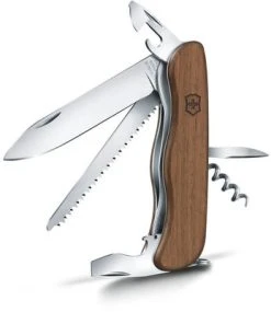 Large Pocket Knife with Wood Scales. Although the forest is its natural habitat, our Forester Wood works just as effortlessly exploring the extremities of the urban jungle. The 10 fully integrated functions include a screwdriver, large locking blade and wood saw. Crafted in beautiful walnut, the scales reflect this large pocket knife’s close affinity to nature.. Tools: large blade – bottle opener – screwdriver 5 mm, lockable – wire stripper – wood saw – can opener – screwdriver 3 mm – reamer, punch – corkscrew – key ring. Key features: 10 functions – Elegant walnut wood scales – Wood saw. Dimensions: Height 18.5 mm – Length 111 mm – Weight 126 g. Finish: Wood
